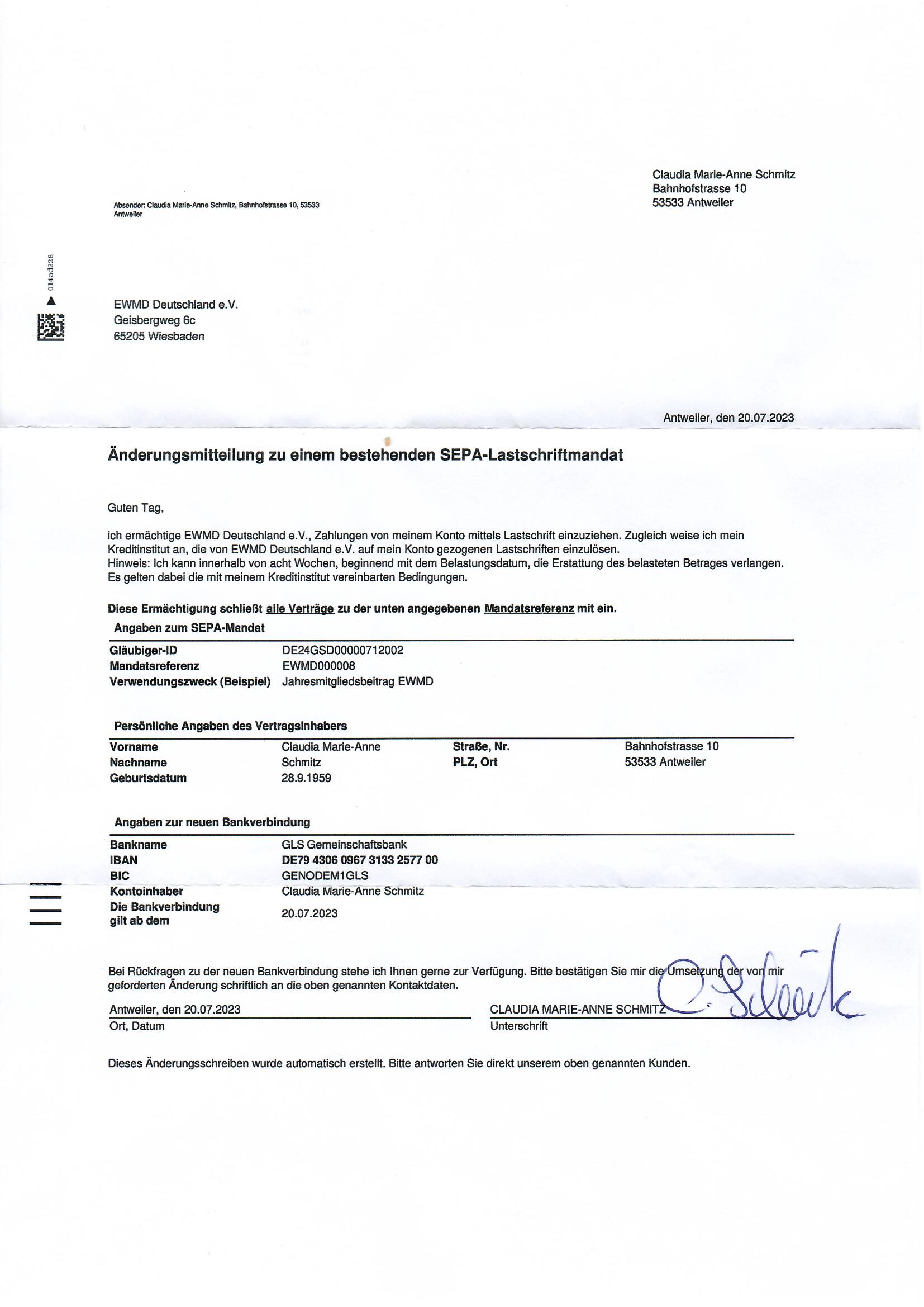 Bank Details: GLS Bank Account Name: EWMD Deutschland e.V.
