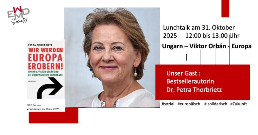 in unserem nächsten EWMD Society Lunch Talk am 31.10.2025 von 12:00 bis 13:00 Uhr beschäftigen wir uns mit der Politik und dem Regime von Viktor Orbán in Ungarn. „Einst war Ungarn der Musterknabe der europäischen Wiedervereinigung, Vorbild für demokratische Reformen, das Land, das den Sowjets die Stirn bot und als erstes den Eisernen Vorhang durchtrennte. Doch seit 15 Jahren höhlen Viktor Orbán und seine Fidesz-Partei das demokratische Fundament ihres Landes aus und bandeln mit autokratischen Regimen auf der ganzen Welt an. Mit klarem strategischen Fokus schwächen sie systematisch Rechtsstaat, Wahlrecht, Bildung an Kindergärten, Schulen und Universitäten, grundlegende Rechte von Opposition, Zivilgesellschaft, Minderheiten und Migranten und vieles andere mehr“, schreibt die preisgekrönte Journalistin und Bestsellerautorin Dr. Petra Thorbrietz in ihrem neu erschienenen Buch „Wir werden Europa erobern! Ungarn, Viktor Orban und die unterwanderte Demokratie“, Verlag Antje Kunstmann 2025