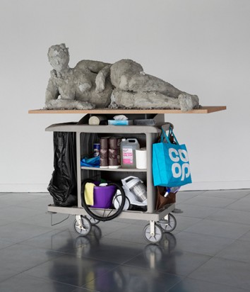 197,2 × 188,2 × 103 cm, Gips, Pigment, Styropor, Stoff, Metall, Holz, Hauswirtschaftswagen, verschiedene Materialien (Courtesy SAMMLUNG VERBUND, Wien und Produzentengalerie Hamburg © Nicole Wermers / Bildrecht, Wien 2026)